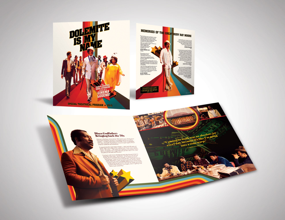 20-page 10" x 10" press booklet created for Netflix to promote Dolemite Is My Name during the premiere event. Booklet design was so well received that over 1000 additional units were printed for the event.