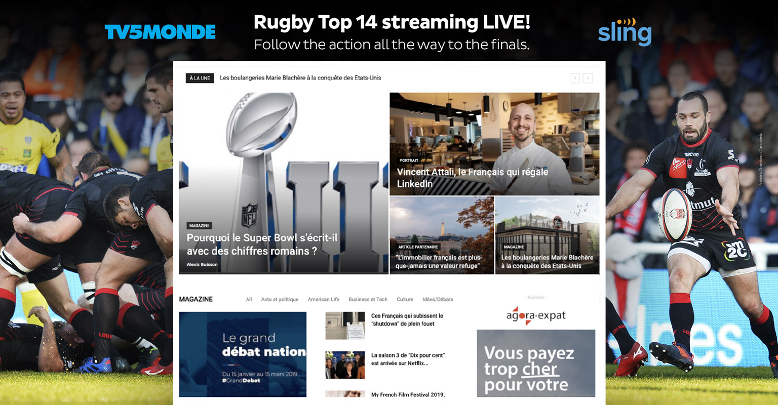 TV5MONDE USA took the opportunity to promote our live sports broadcast events of Ligue 1 soccer and the Top 14 Rugby with a carousel of wallpaper takovers of French Morning Los Angeles homepage.