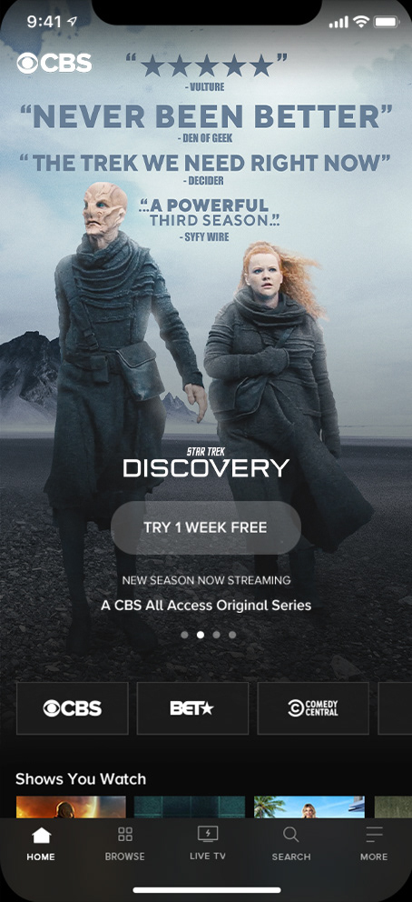 Early season 3 promotion for Star Trek: Discovery promoting critical acclaim. Assets were not yet available for use, so composition was recreated with stock and screengrabs from the early episodes. Campaign was deployed via onsite, paid display, paid social, and partners.